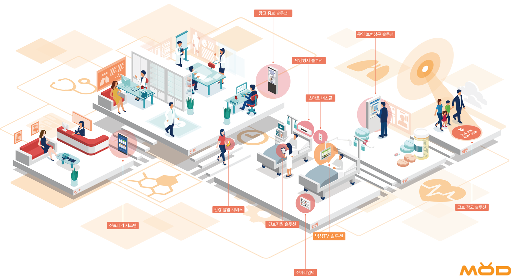 특히, 웨어러블 의료기기와 같은 스마트 헬스케어 기반의 실시간 원격 모니터링 시스템 및 원격 화상 진료, 스마트 너스콜, 스마트 전자 네임택 솔루션, 의료정보 연동 LED 미디어월 구축 등으로 스마트 헬스케어 시장을 선도하는 기업입니다.